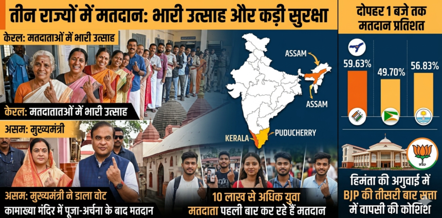 दोपहर 1 बजे तक असम में 59.63%, केरल में 49.70% और पुडुचेरी में 56.83% मतदान दर्ज किया गया। चुनाव आयोग के अनुसार, इस बार तीनों राज्यों में 10 लाख से अधिक मतदाता पहली बार अपने मताधिकार का प्रयोग कर रहे हैं, जो लोकतंत्र के लिए सकारात्मक संकेत है।