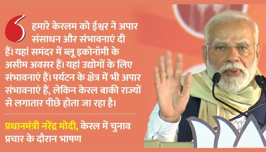 रैली को संबोधित करते हुए प्रधानमंत्री ने कहा कि केरल प्राकृतिक संसाधनों और संभावनाओं से भरपूर राज्य है, लेकिन यहां की सरकारों ने इन अवसरों का सही इस्तेमाल नहीं किया। उन्होंने ब्लू इकोनॉमी, पर्यटन और औद्योगिक विकास का जिक्र करते हुए कहा कि केरल देश के अन्य राज्यों से पीछे होता जा रहा है।